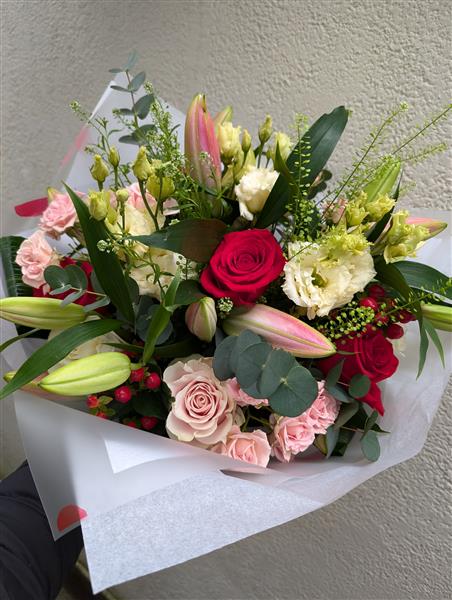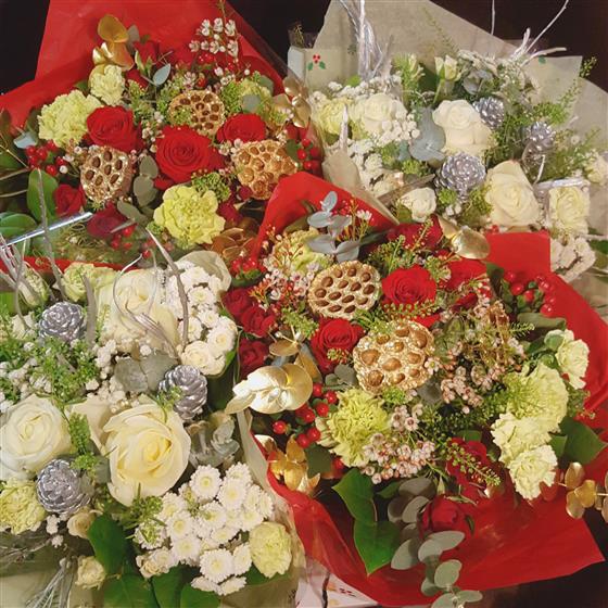 A Christmas seasonal hand-tied bouquet, wrapped and presented in a bubble of water in a box. Flowers will be seasonal but florists choice unless specified.