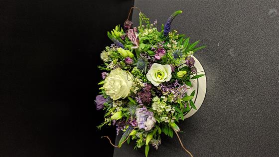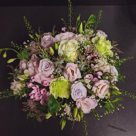 One of our most popular items is the hatbox arrangement. This contains Winter shades such as white, cream, lilac, silver and pale pink/peach - and the hatbox can be kept afterwards too!